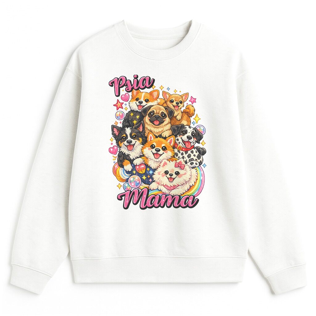 Wiele produktów dla psiar kończy się na prostym haśle i schematycznej grafice. Tutaj jest inaczej. Ten projekt ma energię, kolor i wdzięk. Wesoła kompozycja z kilkoma pieskami buduje lekki, dziewczęcy i bardzo przyjazny klimat. Dzięki temu bluza z psami nie wygląda ciężko ani banalnie. Przyciąga uwagę, ale robi to w sympatyczny sposób. To ważne, bo klientka nie szuka wyłącznie nadruku. Szuka emocji, stylu i czegoś, z czym może się utożsamić.