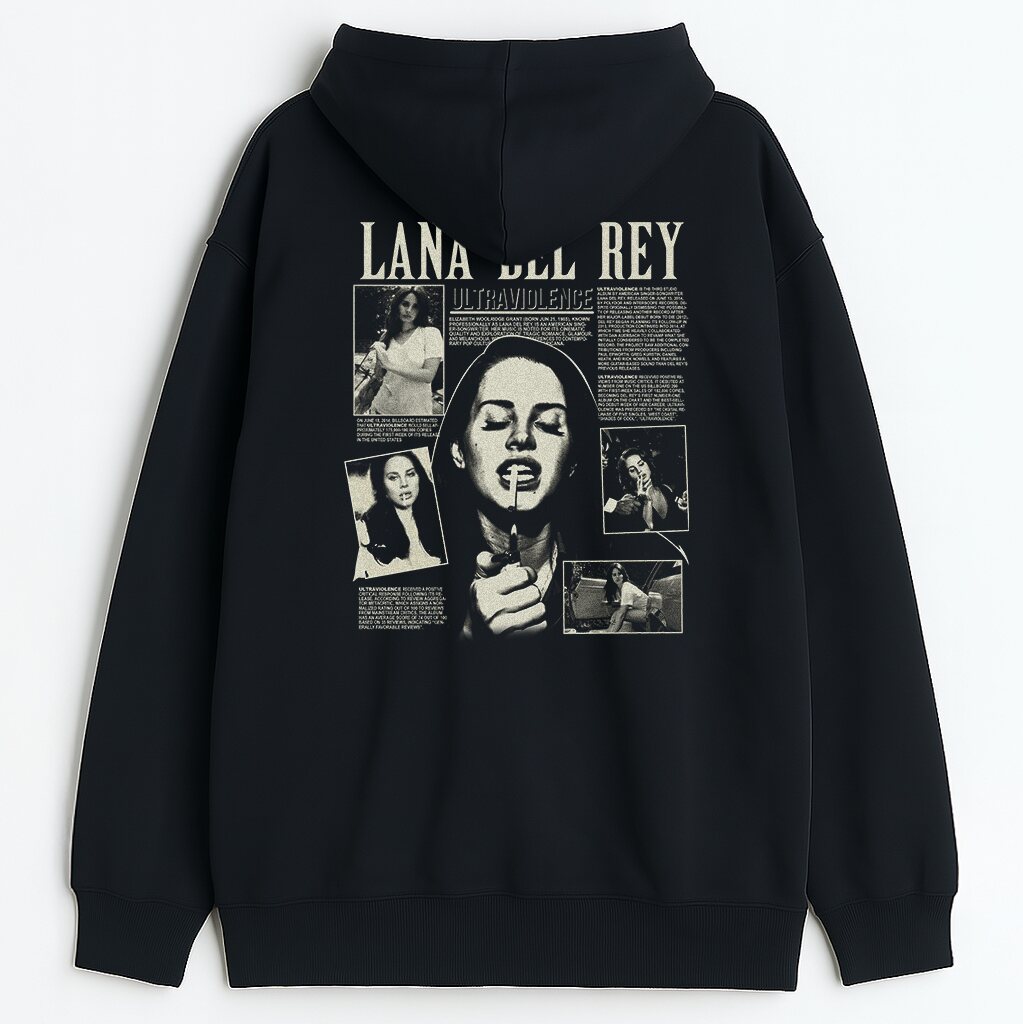 Z przodu: kultowe logo „Lana Del Rey” w retro typografii. Minimalistyczne, ale z mocnym przekazem. Z tyłu: czarno-biały kolaż zdjęć Lany i teksty inspirowane albumem Ultraviolence. Te obrazy nie krzyczą – one szepczą do podświadomości. Dlatego bluza z motywem płyty Ultraviolence robi wrażenie bez nachalności. To styl, który mówi: „wrażliwość też może być siłą”.