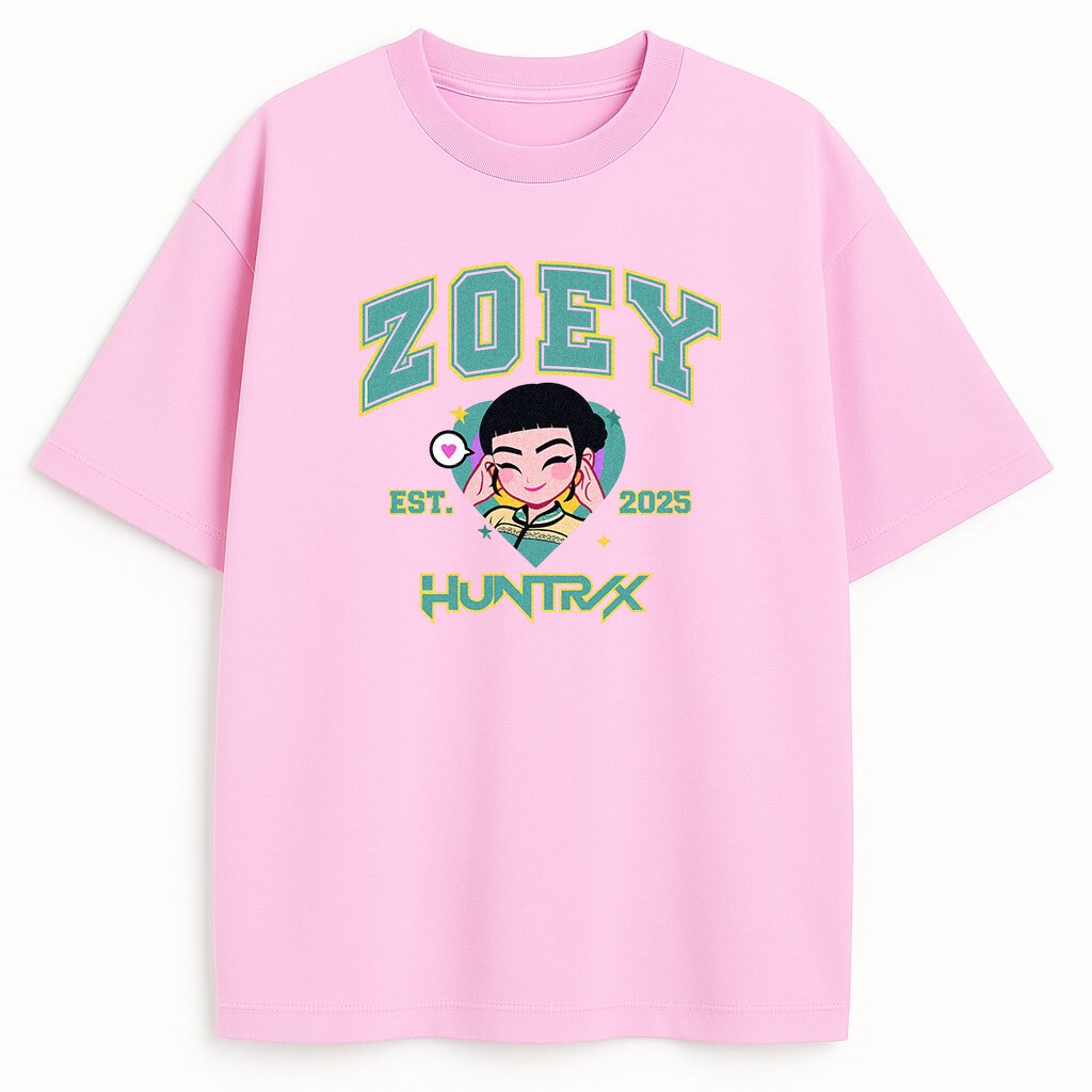 Koszulka Huntrix Zoey Merch to wybuch kreatywności i mocy! Wyobraź sobie, jak stajesz w świetle reflektorów obok Zoey, maknae z KPop Demon Hunters, która rapem i nożami walczy z demonami. Ten T-shirt pulsuje girl power, mieszając college aesthetic z anime Y2K. Dlatego fani HUNTR/X pokochają ten design.