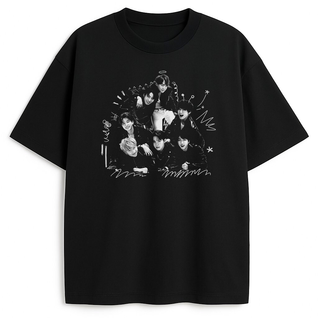 Na froncie znajduje się duża grafika inspirowana estetyką BTS i Bangtan Boys. Nadruk jest wyrazisty, dobrze widoczny i od razu nadaje całości charakteru. To model, który świetnie sprawdza się w luźnych outfitach, a jednocześnie jasno pokazuje, z jakim fandomem się utożsamiasz. Koszulka BTS Bangtan Boys dobrze prezentuje się zarówno w wersji białej, jak i czarnej, dzięki czemu łatwo dopasować ją do własnego stylu. Na stronie produktu dostępne są właśnie te dwa kolory.