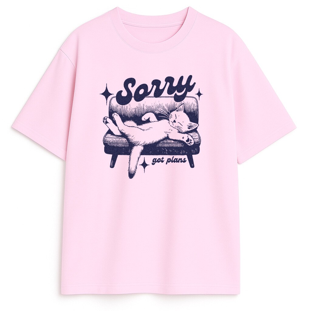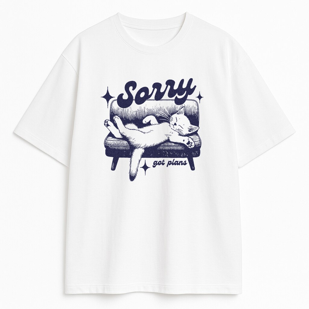 Znasz ten moment, gdy plan dnia to drzemka, kanapa i błogi luz. T-shirt Sorry Got Plans Cat przypomina, że święty jest czas na relaks, a koci humor robi to najlepiej.