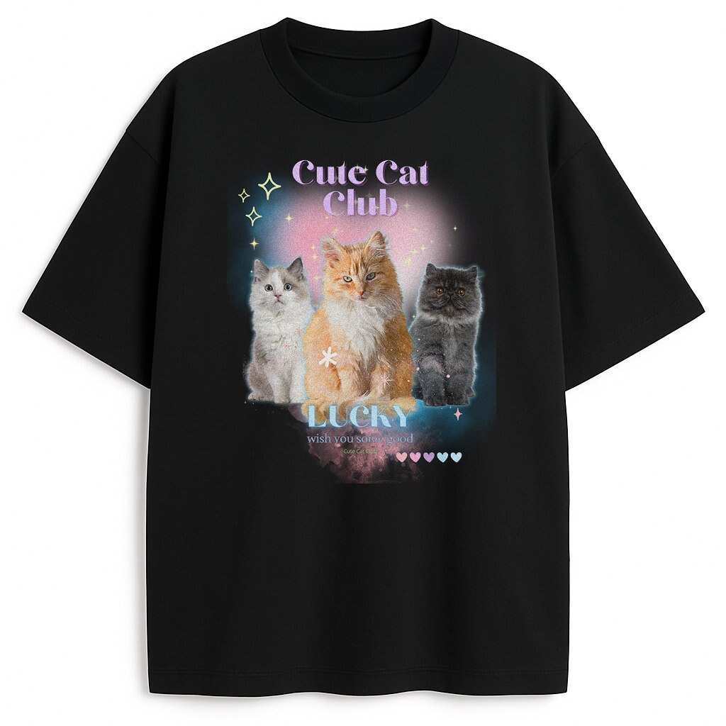 Na froncie widzisz trzy puchate koty w świetlistym ombre. Nad nimi połyskuje napis Cute Cat Club, a niżej lśni fraza Lucky with You Some Good. Dzięki subtelnym blinks i delikatnym gwiazdkom nadruk wygląda jak kadr z marzenia, jednak pozostaje czytelny z daleka.