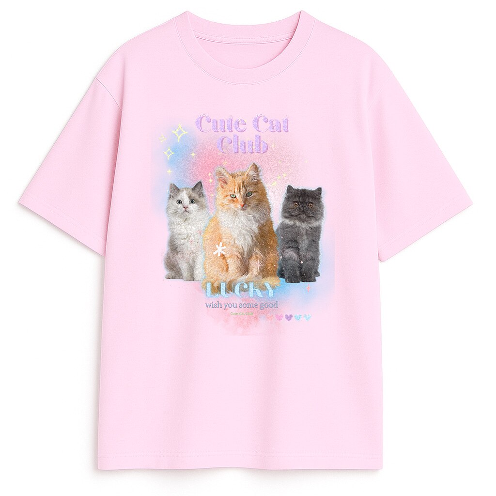 Puszyste koty, ombre cienie, blinks, napis Cute Cat Club i drugi Lucky with You Some Good. Tło ma miękkie przejścia różu oraz błękitu. W rezultacie koszulka daje efekt świeżego filtra, jednak nie przesłania detali futer.