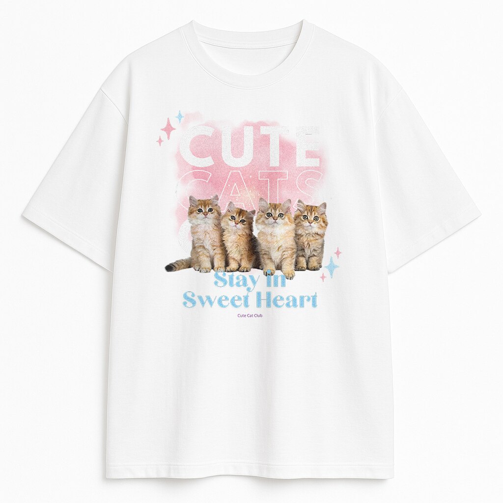 Wieczorny spacer, pastelowe niebo i uśmiech, który pojawia się sam. T-shirt Cute Cats Club przypomina, że czasem wystarczy miękka bawełna i garść słodyczy, aby dzień od razu stał się lżejszy.