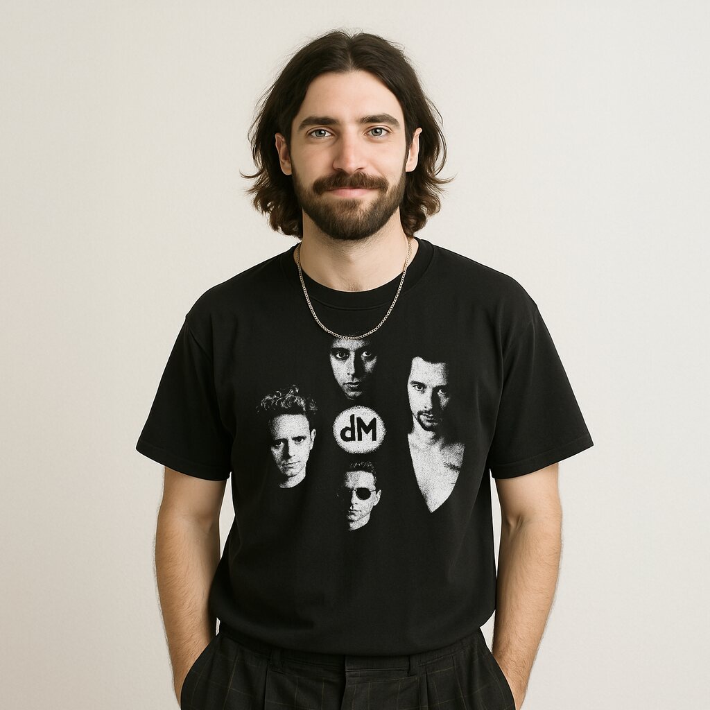 - Ikoniczny nadruk: Portrety zespołu w mono, z logo DM – unikalny hołd dla ich dziedzictwa, nie z masówki.