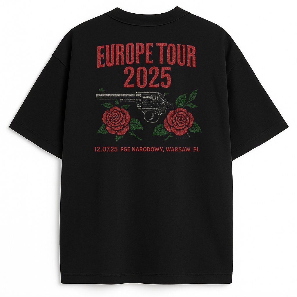 – Z tyłu: dynamiczny napis EUROPE TOUR 2025, dwie róże w pełnym rozkwicie i kultowy rewolwer. Pod spodem — coś, co zmienia zwykły T-shirt w relikwię: 12.07.25, PGE Narodowy, Warsaw, PL.