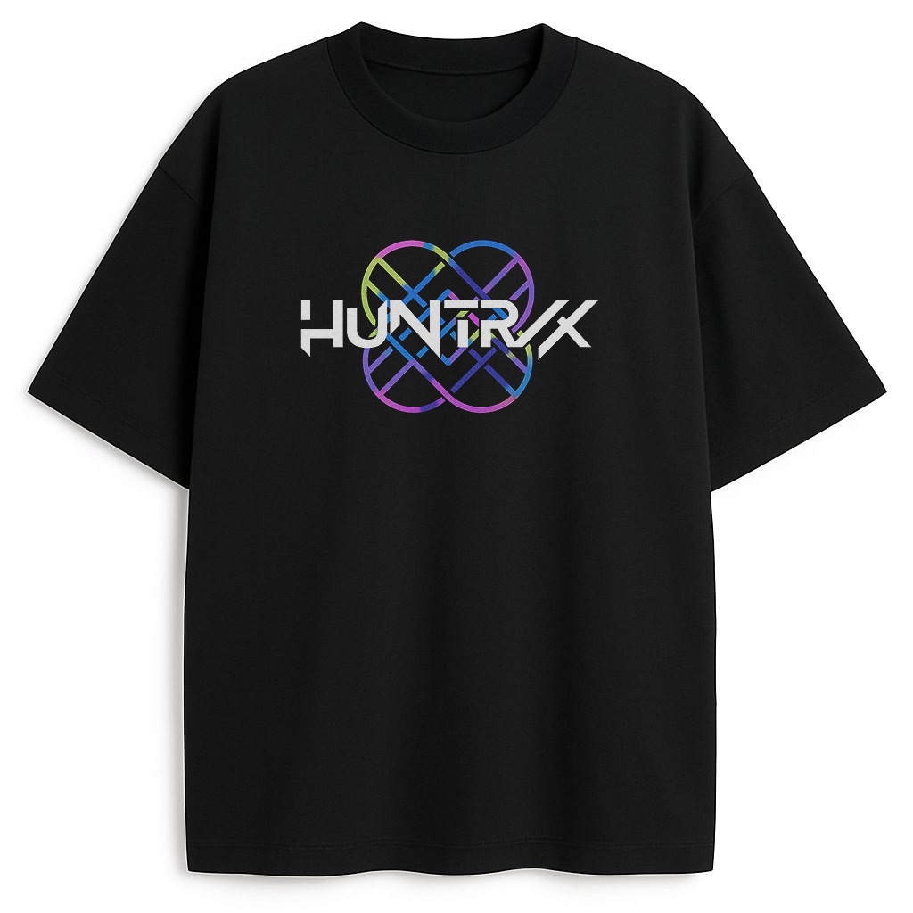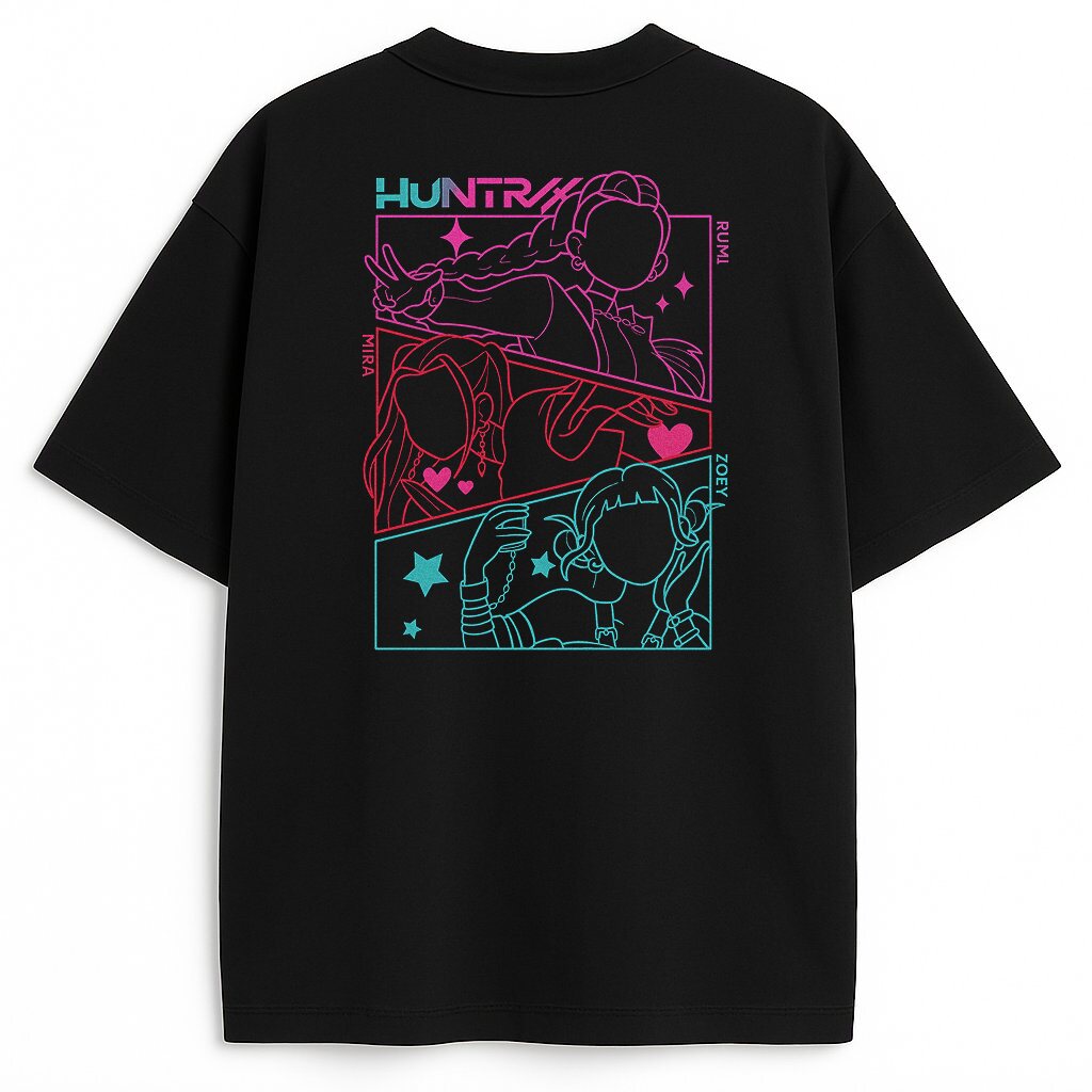 Fabuła? Huntrix splata logo z losami Rumi, Miry i Zoey w KPop Demon Hunters. Dlatego przód to nieskończoność walki z Saja Boys. Ponadto tył pokazuje ich pozy: Rumi z rogami, Mira z sercem, Zoey z bransoletami. Jednak neonowe linie to iskry magii. W dodatku każda kreska krzyczy o zwycięstwie – nie dla mięczaków.