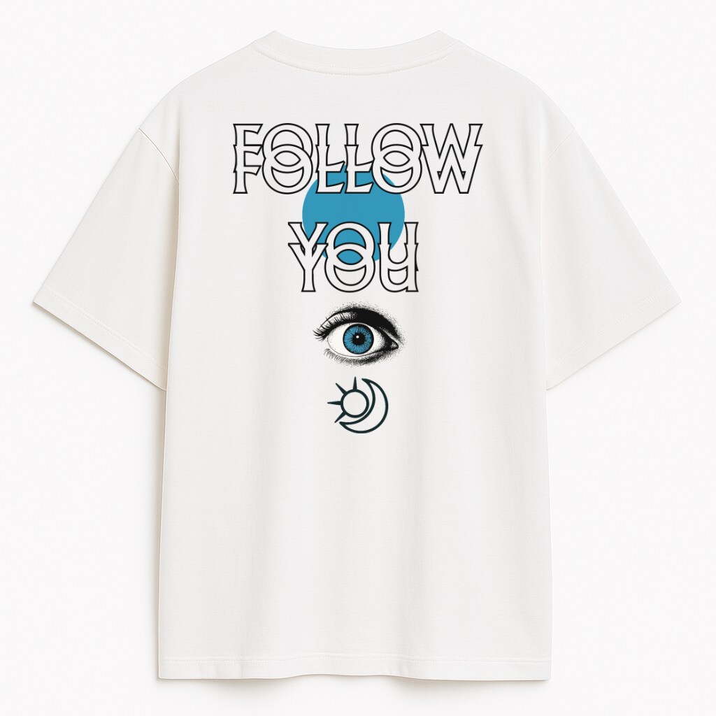 Z kolei na plecach koszulki rozgrywa się coś równie fascynującego. Napis FOLLOW YOU ułożony jest warstwowo na tle błękitnego symbolu – jakby graficzne echo dźwięku, które rezonuje w świadomości. Tuż pod nim – precyzyjnie narysowane oko, intensywnie niebieskie, które patrzy wprost w odbiorcę. Całość wieńczy symbol księżyca – tajemnicy, nocy, wyobraźni.