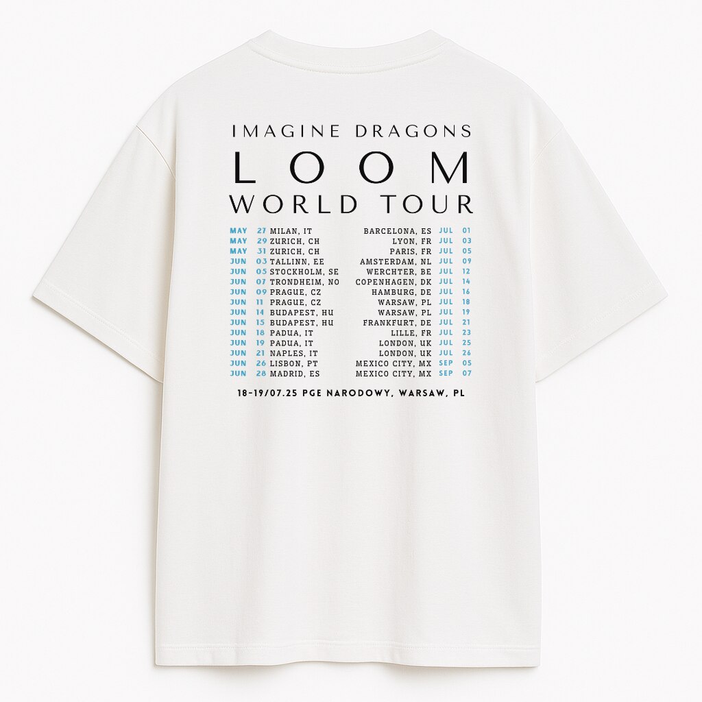 Tył koszulki to konkret. Lista miast LOOM WORLD TOUR 2025, uporządkowana według dat i lokalizacji. PGE Narodowy? Jest. Berlin, Londyn, Meksyk? Są. I właśnie dlatego koszulka Imagine Dragons Loom Mirror staje się fanowskim kalendarzem, mapą emocji, pamiątką z trasy, która poruszyła tysiące serc. Dla wielu – to sposób na upamiętnienie koncertu życia 🖤