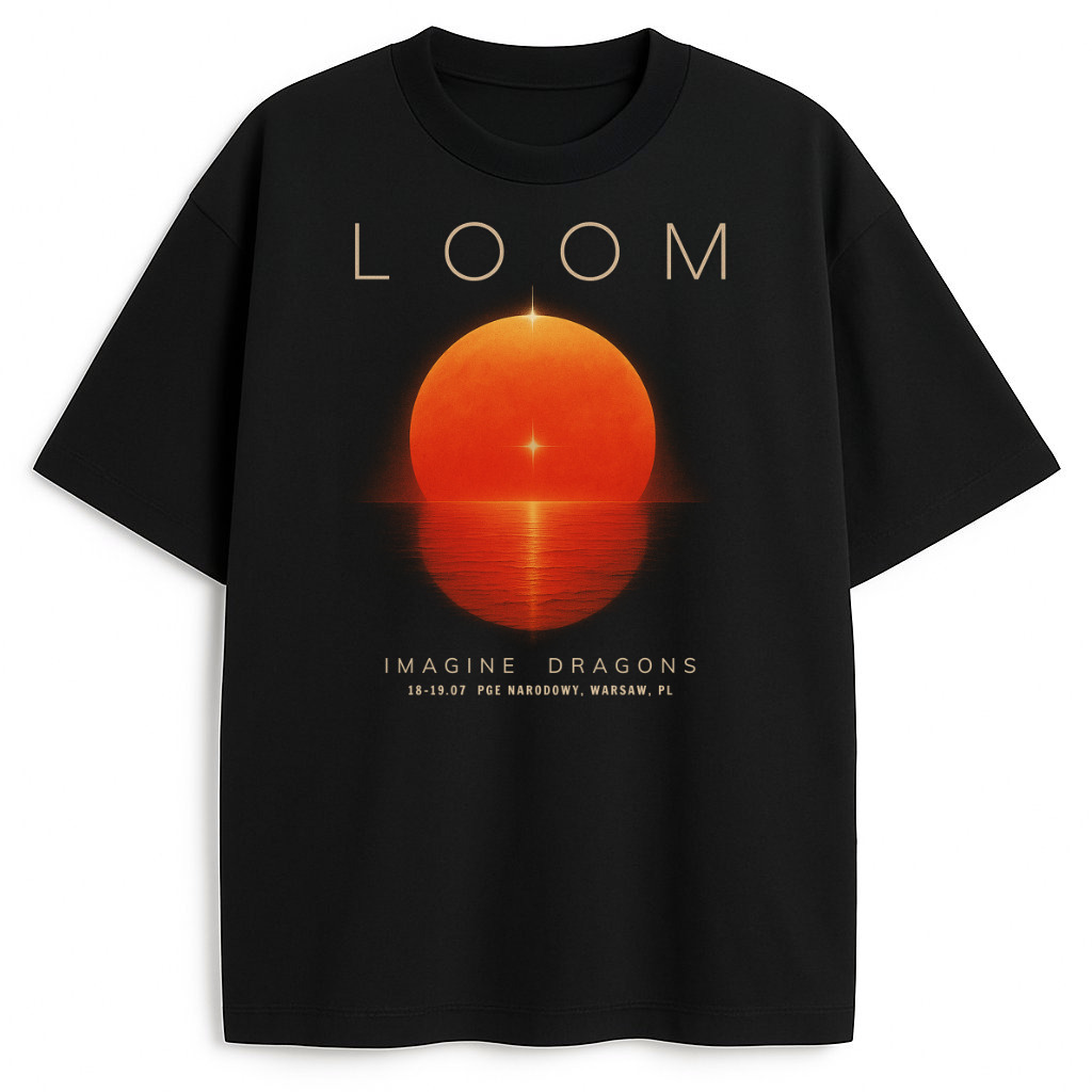 Ten projekt z trasy LOOM to fanowski bestseller, który łączy estetykę i emocje. Z przodu dominuje pomarańczowe słońce zawieszone nad spokojną taflą morza, minimalistyczne logo LOOM oraz precyzyjnie wybity napis: Imagine Dragons – 18–19.07, PGE Narodowy, Warsaw, PL. Bez krzyku, bez przesady – tylko światło, muzyka i wspomnienie, które nadal rezonuje w sercu.