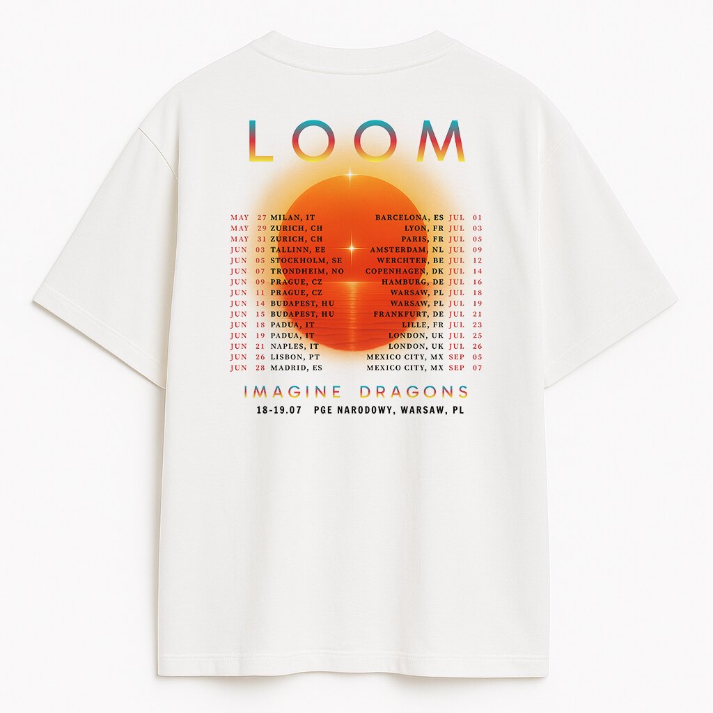 Obróć koszulkę i zobacz całą historię. Tył zdobi pełna lista miast z trasy Imagine Dragons LOOM 2025, ułożona niczym liturgia rockowej pielgrzymki – od Mediolanu, przez Lizbonę, aż po Mexico City. Pośrodku – symboliczne słońce, a tuż obok wyraźnie wybita pieczęć: 18–19.07, Warsaw, PL.