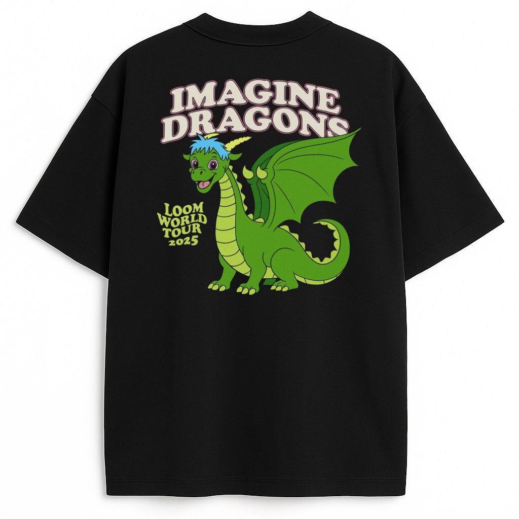 Z przodu – elegancki, ale wyrazisty napis „IMAGINE DRAGONS – LOOM WORLD TOUR 2025” w neonowym stylu. Z tyłu – pełen blasku, bajkowy smok z irokezem i bananem na pysku. Ten projekt to czysta energia koncertu, ale pokazana w lżejszej, humorystycznej odsłonie. Nie trzeba go tłumaczyć. Wystarczy założyć – i poczuć się częścią tej wyjątkowej trasy 🎶