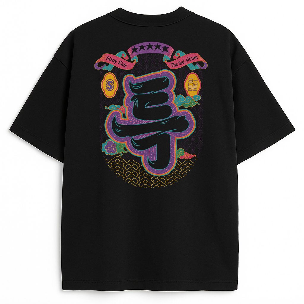 Symbolika z tyłu to hołd dla tradycji, przefiltrowany przez nowoczesną estetykę tour merchu. A z przodu – pięć gwiazd i nazwa Stray Kids jak podpis pod czymś, co już jest legendą.