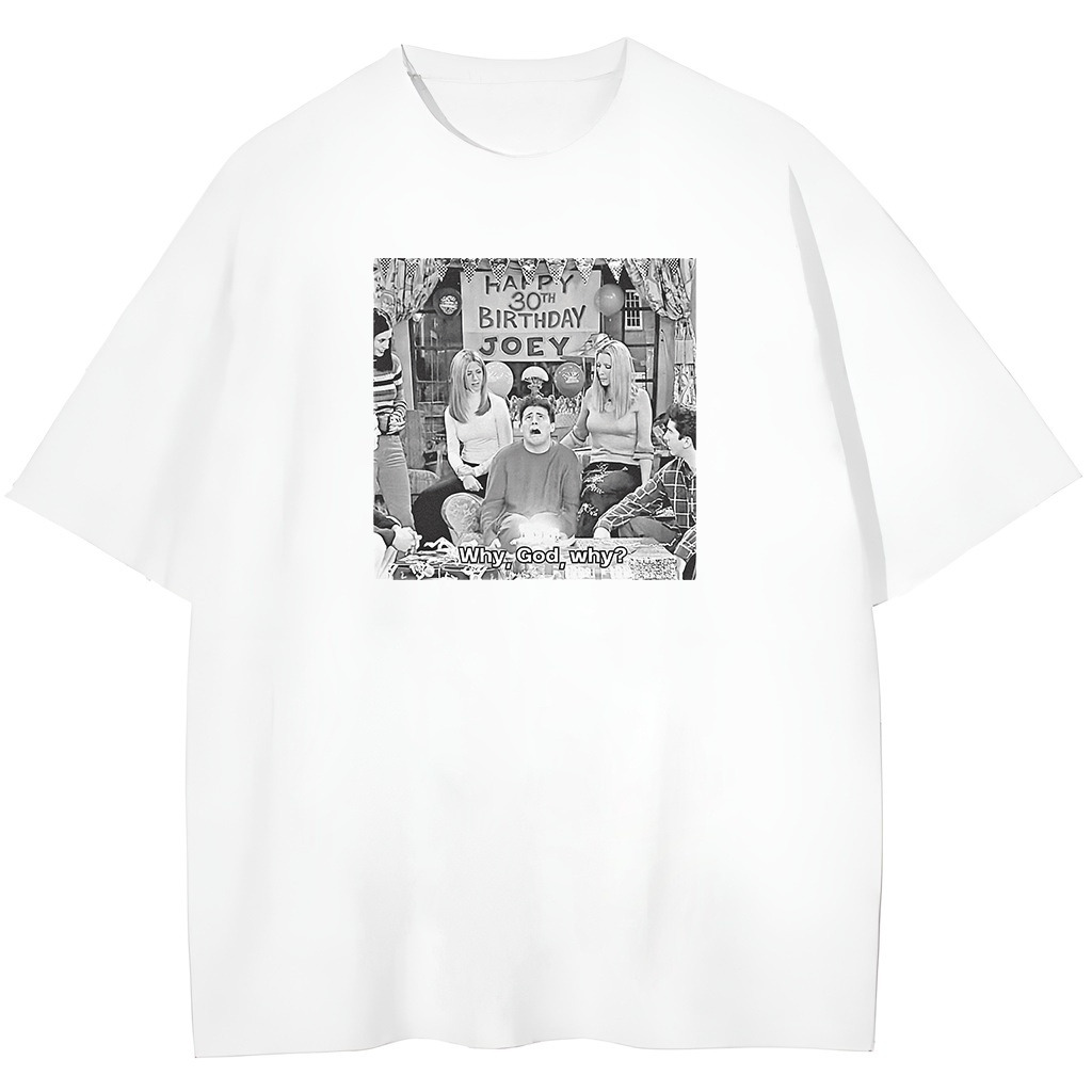 Każdy fan Friends zna ten moment, gdy Joey uświadamia sobie, że Ross właśnie skończył 30 lat. Teraz możesz mieć tę legendarną scenę na swojej koszulce! T-shirt Friends Why God Why to idealna propozycja dla każdego, kto kocha kultowy serial i ma dystans do własnych urodzin. Na przodzie koszulki znajduje się zdjęcie z niezapomnianej sceny 30. urodzin Rossa, która do dziś rozbawia fanów na całym świecie.