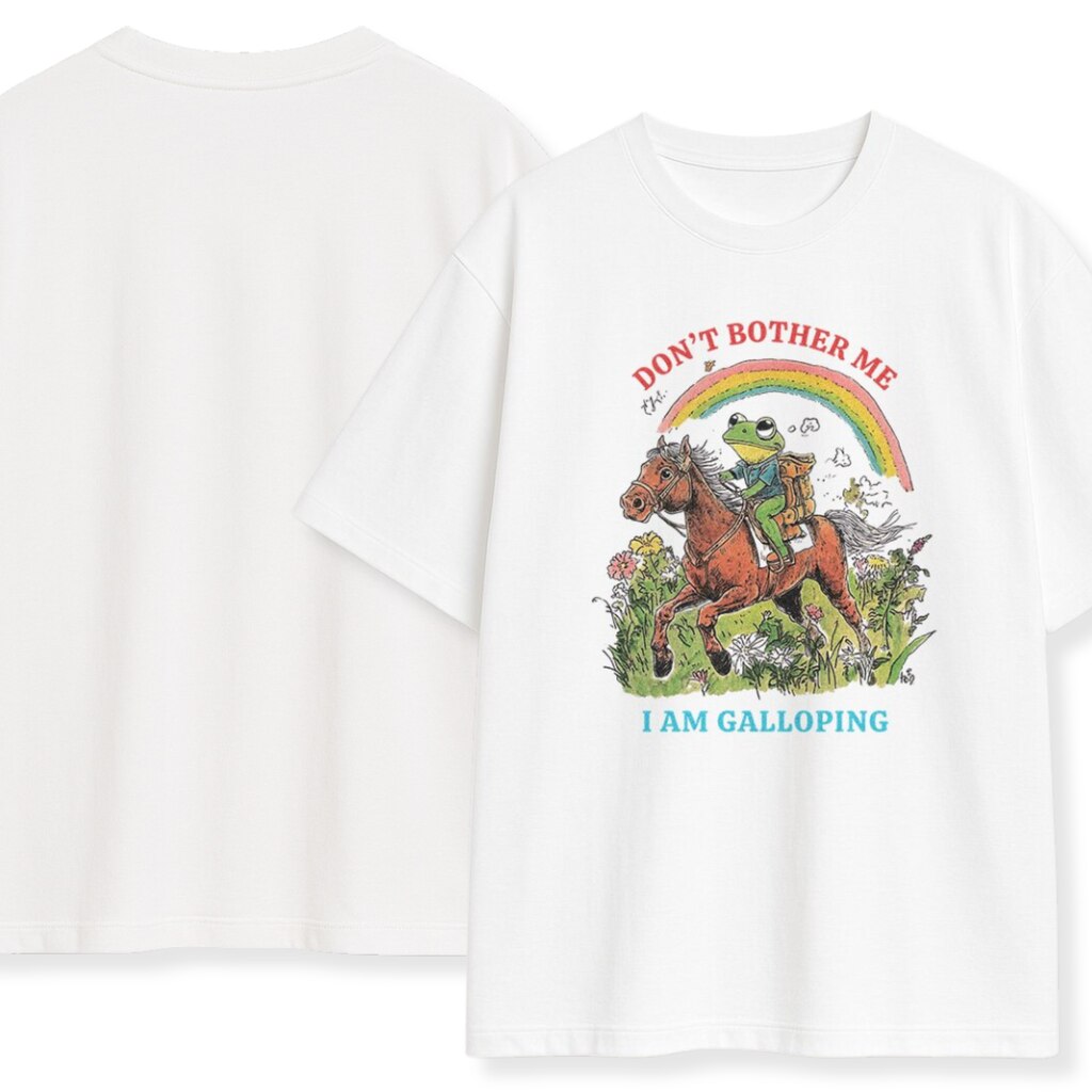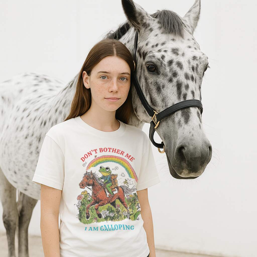 T-shirt I Am Galloping to ukłon w stronę ludzi, którzy zamiast tłumaczyć – po prostu przyspieszają. Grafika jak z lat 90. uderza w nostalgię: żaba w siodle, koń w galopie, tęcza i hasło „Don’t Bother Me, I Am Galloping”. Dzięki temu od razu wiadomo, jaki masz nastrój: teraz tempo, później rozmowy.
