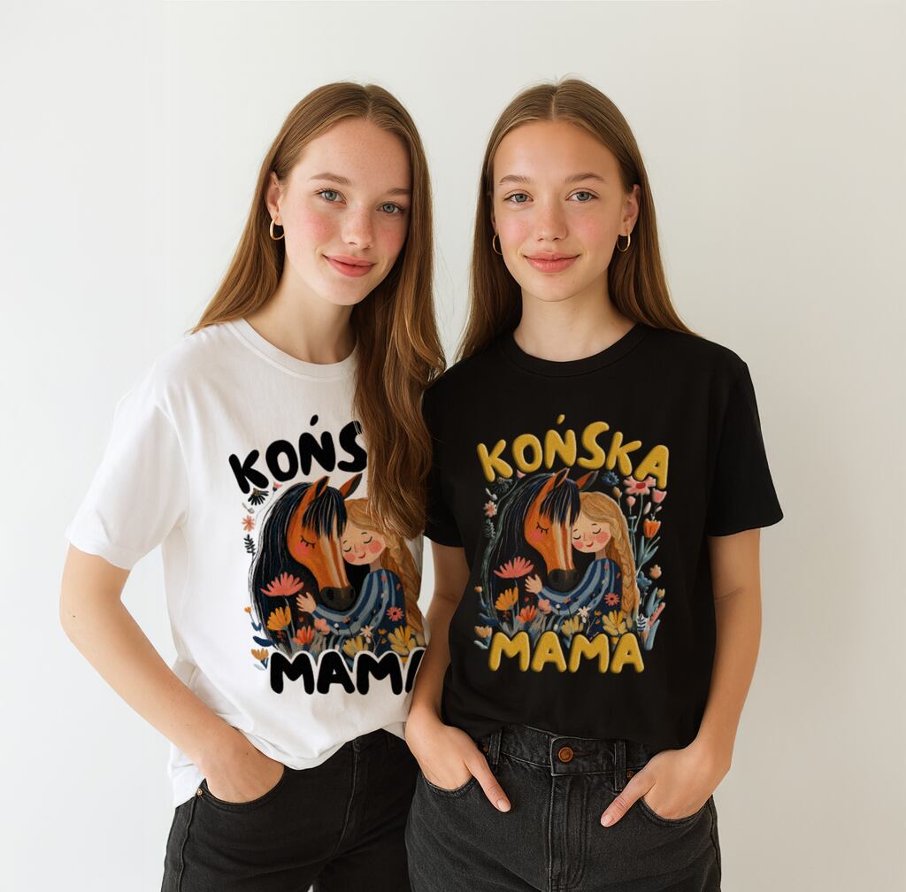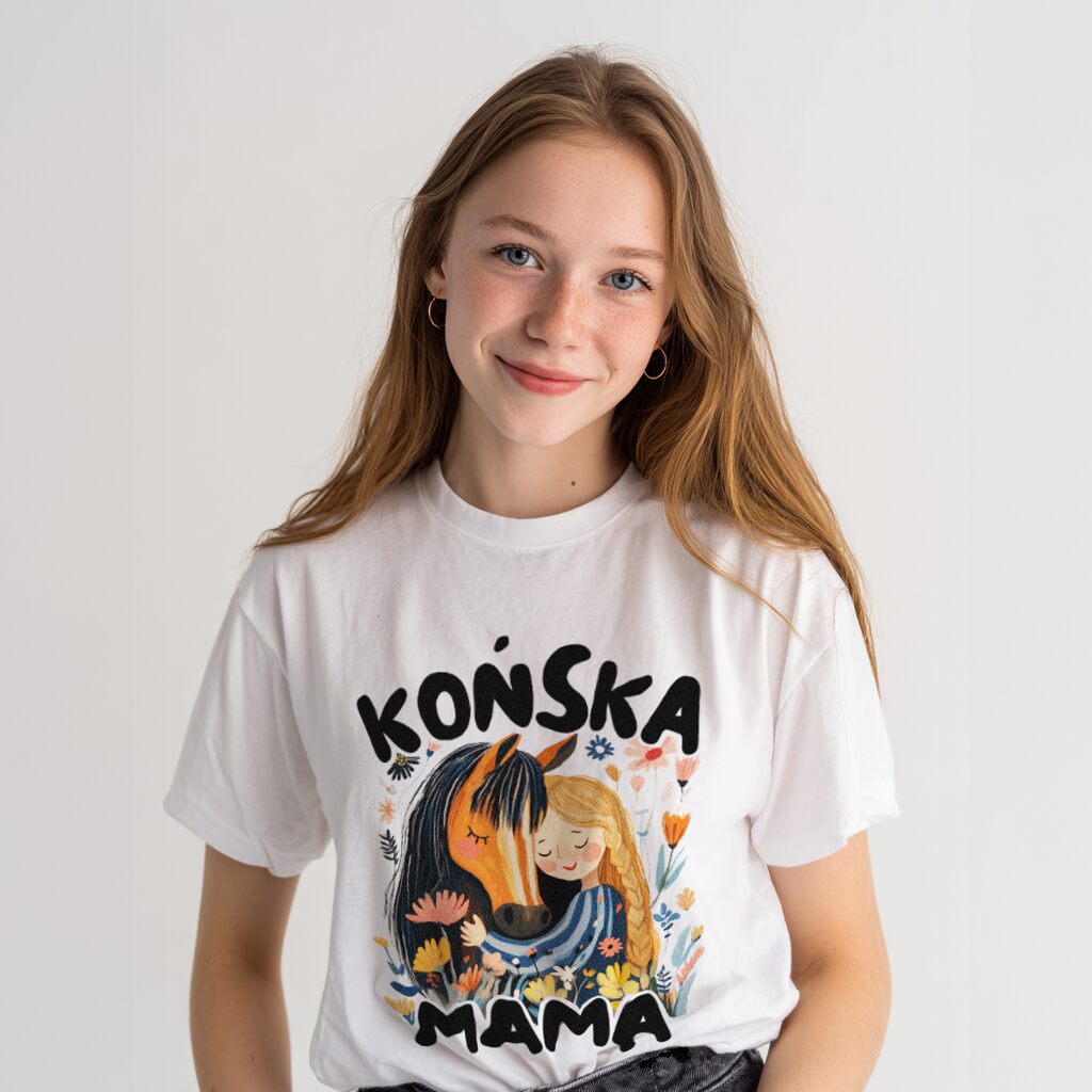 Kiedy zakładasz tę koszulkę, wracasz myślami do chwili, w której koń pierwszy raz zaufał na sto procent. Ilustracja pokazuje dziewczynę wtuloną w brązowego wierzchowca; wokół kwiaty, jak te przy padoku, a nad wszystkim łagodny napis KOŃSKA MAMA. Po pierwsze, projekt jest czytelny z daleka, więc pracuje na zdjęciach i przy sztucznym świetle hali. Z kolei z bliska widać miękkie „pociągnięcia” pędzla, które nadają rysunkowy, aesthetic klimat.