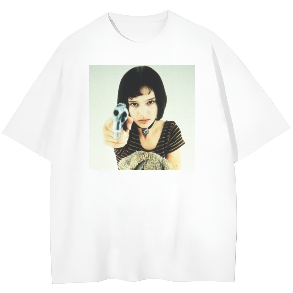 Biała koszulka ozdobiona jest ikonicznym kadrem z filmu – Matylda, tuląc maskotkę, celuje pistoletem. Ta scena to nie tylko filmowa estetyka, ale i symbol siły, buntu i emocjonalnej głębi. W minimalistycznym, monochromatycznym wydaniu nadruk nabiera jeszcze większego wyrazu, nadając koszulce artystyczny, surowy charakter.