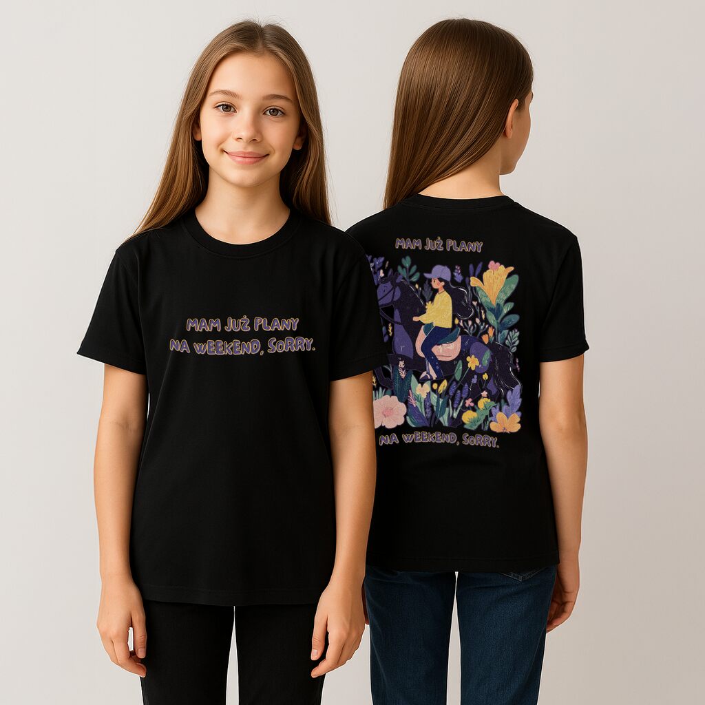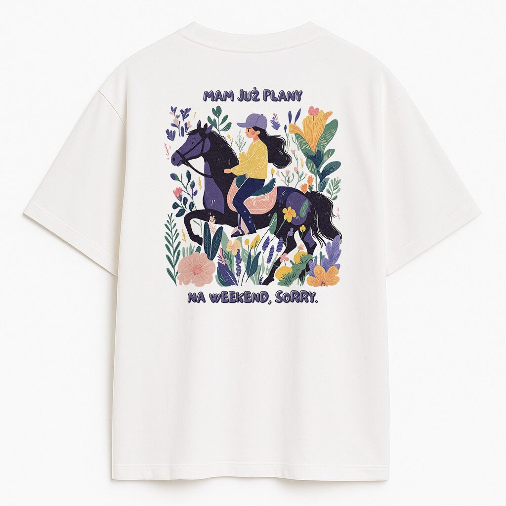 Front mówi wprost: „Mam już plany na weekend, sorry.” Tył opowiada historię — dziewczyna jedzie na wierzchowcu wśród kwiatów i liści, jak z kart ilustracji książkowej. Kompozycja jest spójna, dziewczęca i czytelna z daleka. Do wyboru masz kolory: czarny i biały, więc z łatwością dopasujesz koszulkę do ulubionych jeansów i kurtek. Krój unisex, lekko oversize układa się swobodnie i podkreśla luz stajennego życia, ale pasuje też do miejskich stylizacji.