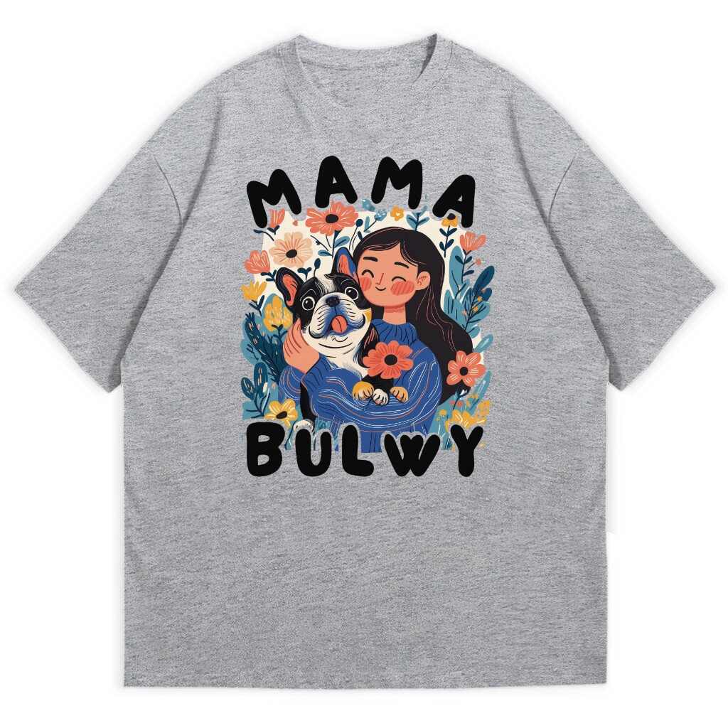 Jeśli jesteś dumą mamą buldoga francuskiego lub po prostu kochasz te urocze, marszczone pyski, ten T-shirt jest dla Ciebie! Grafika przedstawia dziewczynę czule wtuloną w swojego pupila, a całość otacza bajeczny kwiatowy motyw. Ilustracja wygląda jak ręcznie malowana, co dodaje jej wyjątkowego charakteru. Dopełnieniem jest zabawny napis „MAMA BULWY” – bo przecież buldogi to najpiękniejsze „bulwy” świata! 🥰
