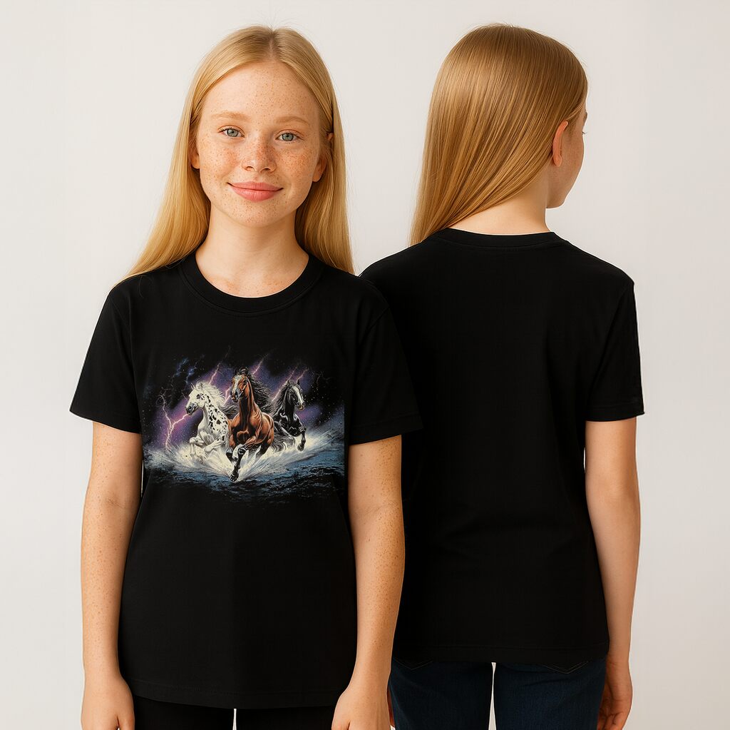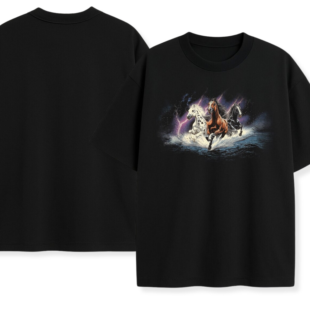 T-shirt Mystic Mustangs to oldschoolowa koszulka z energią lat 90., zaprojektowana dla osób, które kochają konie i wyraziste nadruki. Od pierwszego spojrzenia czuć ruch, bryzg wody i błysk piorunów — to look, który wyróżnia się w stajni i w mieście.