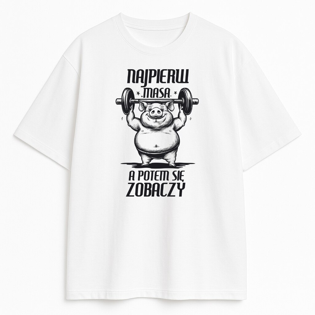 T-shirt Najpierw Masa Potem Się Zobaczy – bo mięśnie przychodzą i odchodzą, ale dystans do siebie to siła, która zostaje.