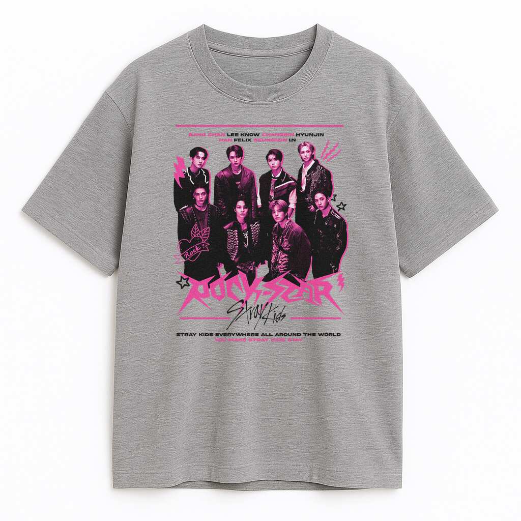 To nie jest zwykła koszulka z nadrukiem. T-shirt Stray Kids to stylowy wybuch energii inspirowany najnowszą erą zespołu. Neonowy róż gra tu pierwsze skrzypce, bijąc po oczach jak światła sceniczne na bisie. A w centrum? Członkowie Stray Kids w elektryzującej formacji – ubrani, jakby właśnie zeszli ze sceny po koncercie, który zapisze się w historii.