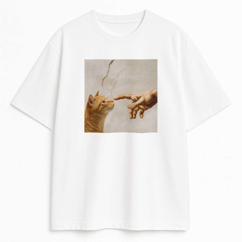T-shirt Stworzenie Kota to artystyczny żart z galerii przeniesionej na ulicę. Grafika łączy renesansowy kadr z humorem, dlatego od pierwszego spojrzenia wciąga w historię. Biała lub czarna baza z 100% bawełny daje komfort noszenia w rozmiarach 134-3XL przez cały rok.