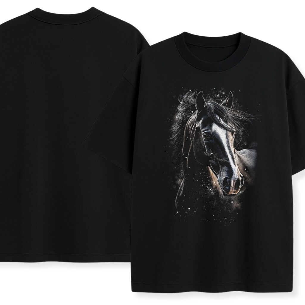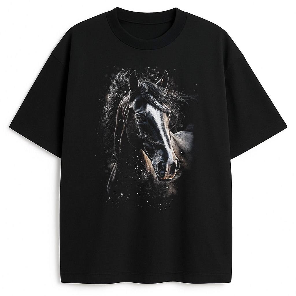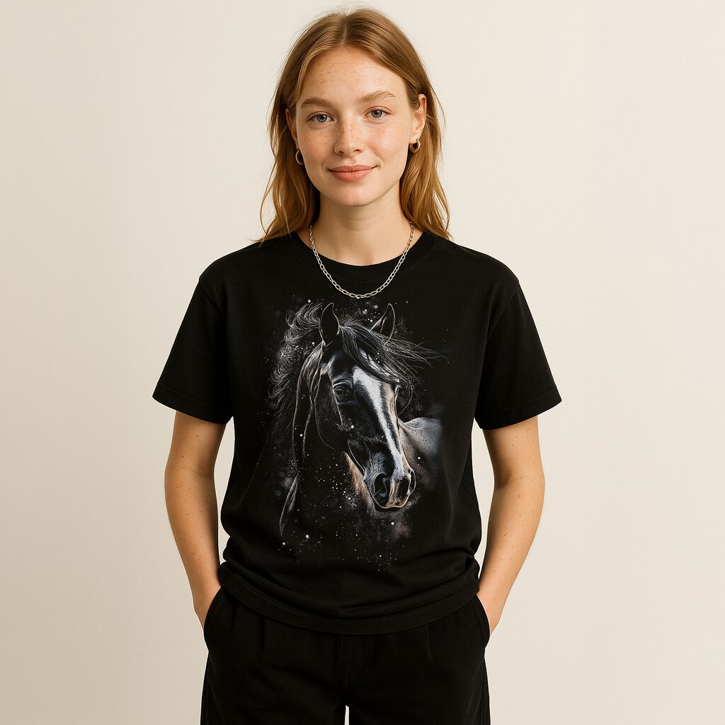 Realistyczny portret na czarnym tle wygląda jak stop-klatka tuż przed przyspieszeniem. Ponieważ kontrast jest mocny, kontury pyska i grzywy rysują się wyraźnie; co więcej, drobne „iskry” wokół głowy dodają dynamiki, jak pył unoszący się nad padokiem. W efekcie koszulka z koniem robi wrażenie w mieście i w stajni.